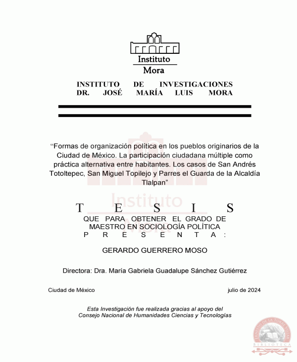 Formas de organización política en los pueblos originarios de la Ciudad de México : la participación ciudadana múltiple como práctica alternativa entre habitantes. Los casos de San Andrés Totoltepec, San Miguel Topilejo y Parres el Guarda de la Alcaldía Tlalpan/ Gerardo Guerrero Moso ; directora María Gabriela Guadalupe Sánchez Gutiérrez