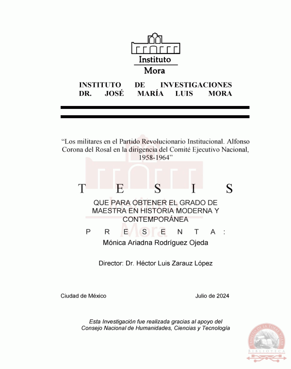 Los militares en el Partido Revolucionario Institucional : Alfonso Corona del Rosal en la dirigencia del Comité Ejecutivo Nacional, 1958-1964/ Mónica Ariadna Rodríguez Ojeda ; director Héctor Luis Zarauz López