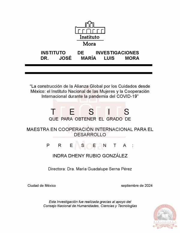 La construcción de la Alianza Global por los Cuidados desde México : el Instituto Nacional de las Mujeres y la Cooperación Internacional durante la pandemia del COVID-19 / Indra Dheny Rubio González ; directora María Guadalupe Serna Pérez