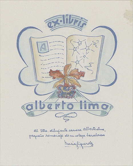 Dedicatoria manuscrita de la diseñadora María Figuerola al propietario Alberto Lima: al Iltre. dibujante carioca Alberto Lima, pequeño homenaje de su colega barcelonesa María Figuerola