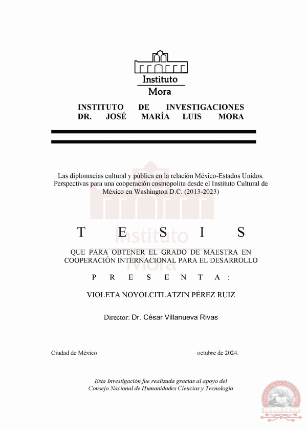 Las diplomacias cultural y pública en la relación México-Estados Unidos : perspectivas para una cooperación cosmopolita desde el Instituto / Violeta Noyolcitlatzin Pérez Ruiz ; director César Villanueva Rivas