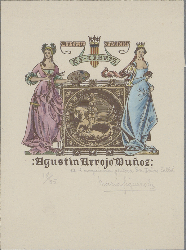 Firma de la grabadora Mª Figuerola en el ángulo inferior derecho. Dos figura alegóricas del arte y la tradición, apoyadas en las esquinas de un marco; dentro de éste, San Jorge. Inscripción en el borde inferior: "Agustín Arrojo Muñoz" Inscripción en el borde superior: "Arte y Tradición / EX-LIBRIS"