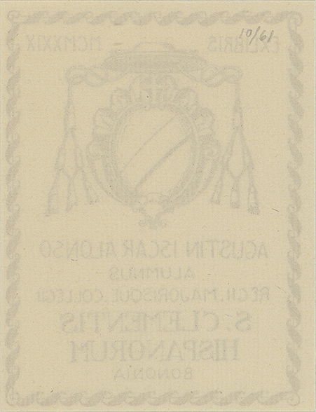 Inscripción dentro de la composición: Alumnus Regii. Majorisque. Collegii. S. Clementis Hispanorum Bononia