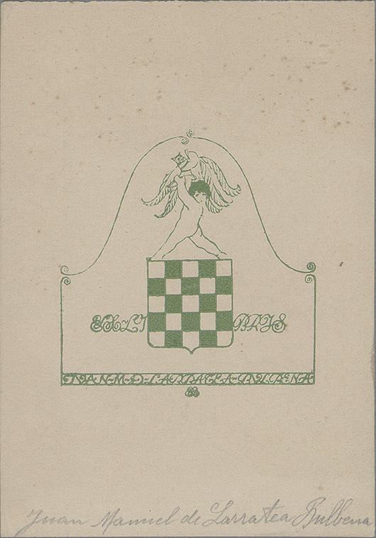 [Ex libris de Juan Manuel de Larratea Bulbena]/ propietario Juan Manuel de Larratea Bulbena ; diseñador EB [monograma]