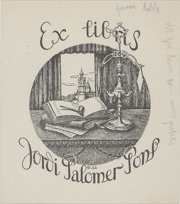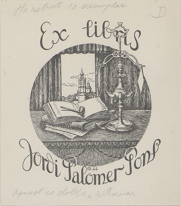 [Ex libris Jordi Palomer Pons]/ Propietario Jordi Palomer Pons ; diseñador M.V. [monograma]