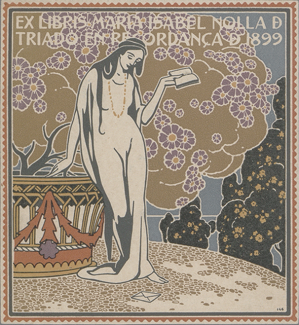 Exlibris elaborado por Triadó para conmemorar el año en el que conoció a María Isabel Nolla. Una composición ornamental en la que, en un jardín, una figura femenina con un libro abierto mira un sobre que está caído en el suelo, al fondo hay árboles con flores de diversos colores.