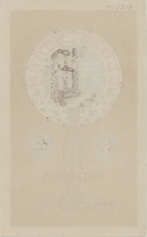 Exlibris modernista: en el medallón central, mano (búho subido a la palanca) que acciona una prensa (rama de laurel emergiendo en una esquina). En los laterales, pequeños medallones con cintas en los que se representan útiles de estampar (tampones y botes de tinta).