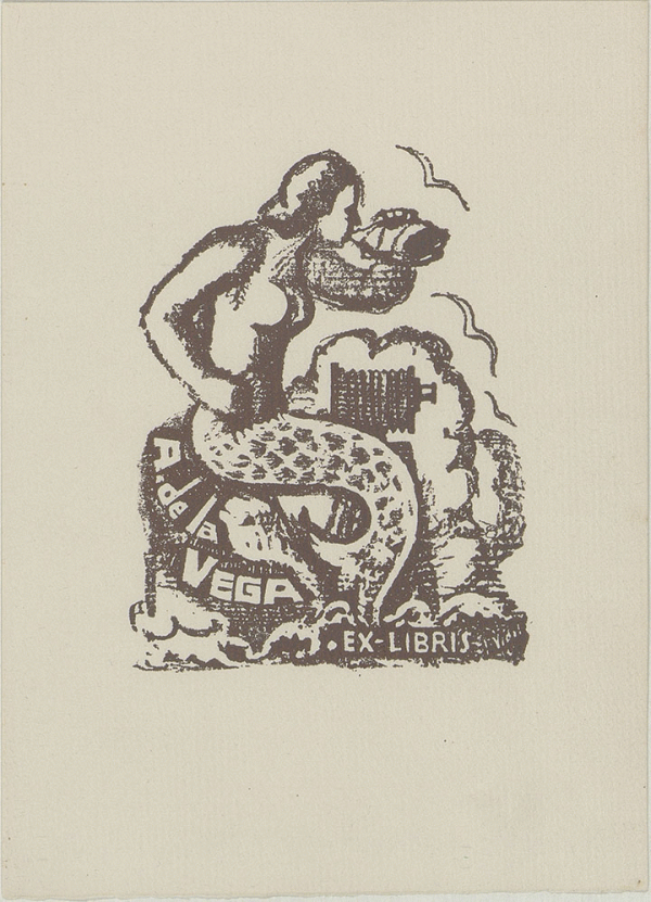 [Ex Libris de A. de la Vega] Propietario A. de la Vega ; diseñador I. Vidal