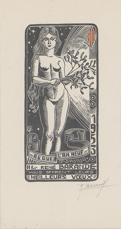 El texto dice en francés "KAN NEUF" (un juego de palabras para 'Quand neuf' o 'Cuando nuevo' en argot, refiriéndose al Año Nuevo) y "H. & RENÉ BARANDE VOUS OFFRENT LEURS MEILLEURS VOEUX.", que se traduce como "H. & René Barande les ofrecen sus mejores deseos".