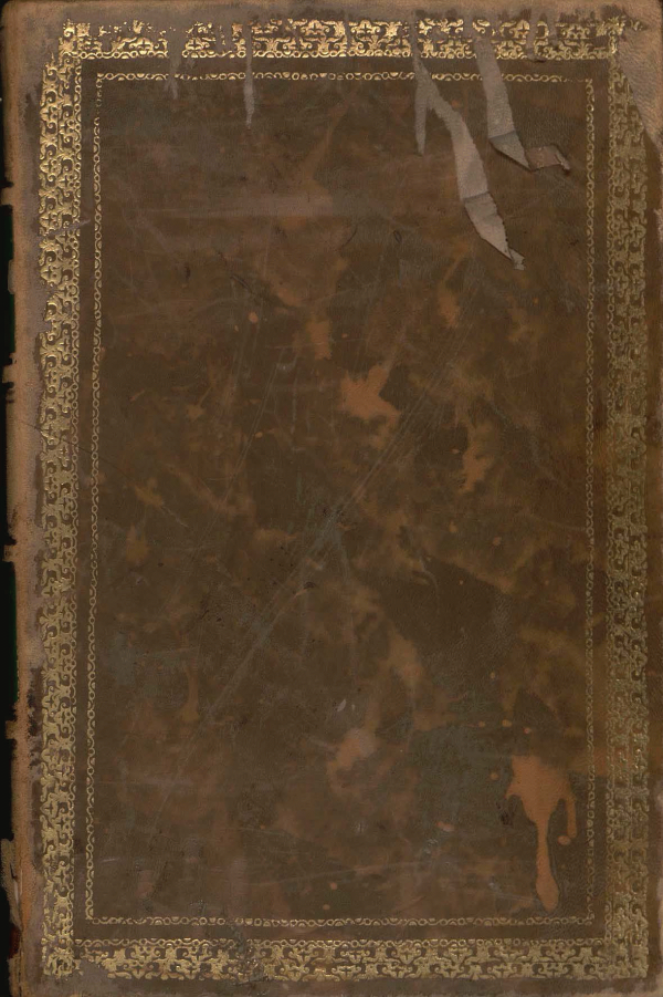 Encuadernación entera en cuero jaspeado, con tapa anterior y posterior decoradas en gofrado dorado (marco doble) y carretilla dorada en canto interior. Cuenta con guardas impresas (marmoleado industrial)